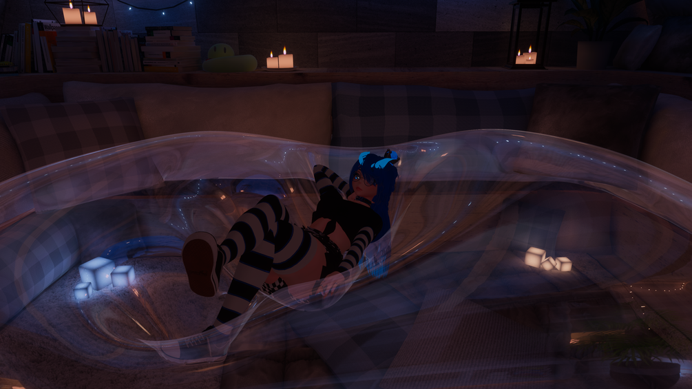 Many body options that change her slime skin. This includes: Refraction, blur, transparency, temperature (increases bubbles and speed of her skin movement). Toggles between normal human skin and lava lamp skin.