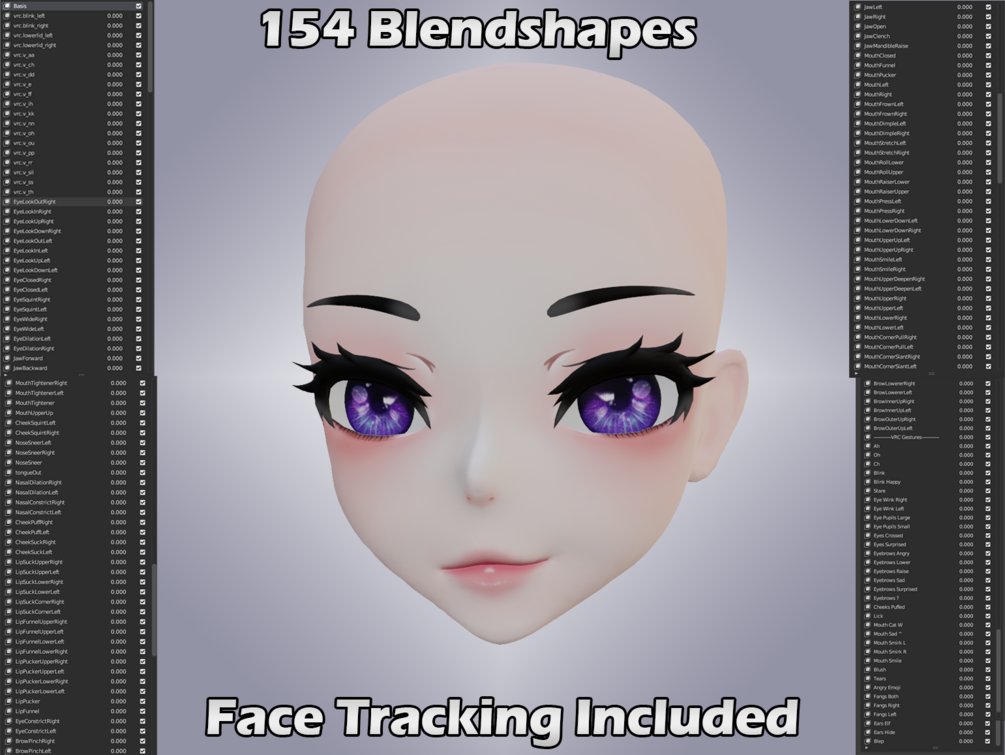 154 shapekeys (This includes all advanced unified expression shapes except tongue blendshapes and select simplified shapes to easily add face tracking.)